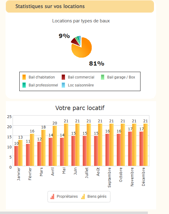 Cet article est un mode opératoire et vous apporte une compréhension du tableau de bord. Le module Statistiques sur vos locations vous permet de visualiser rapidement la répartition de vos baux ainsi que l’évolution de votre parc locatif au fil de l’année. Cette rubrique est accessible depuis votre tableau de bord et vous fournit deux types d’indicateurs : Les types de baux en gestion et votre parc locatif mensuel.