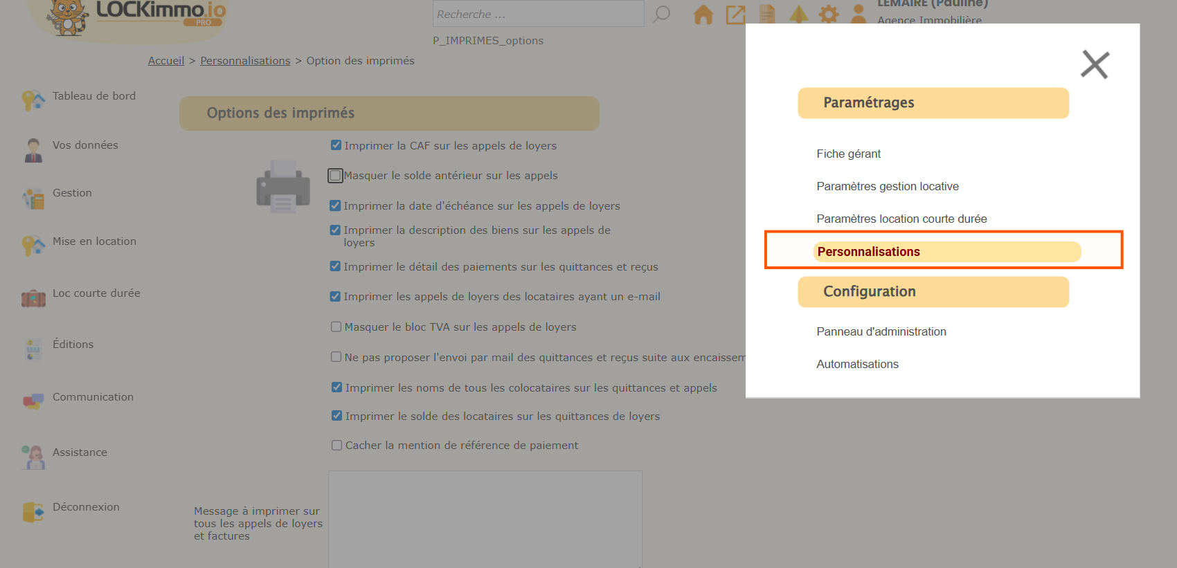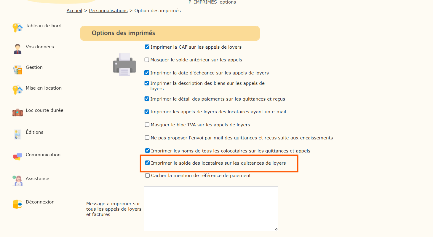 Recherchez l’option intitulée « Imprimer le solde locataires sur les quittances de loyer ».