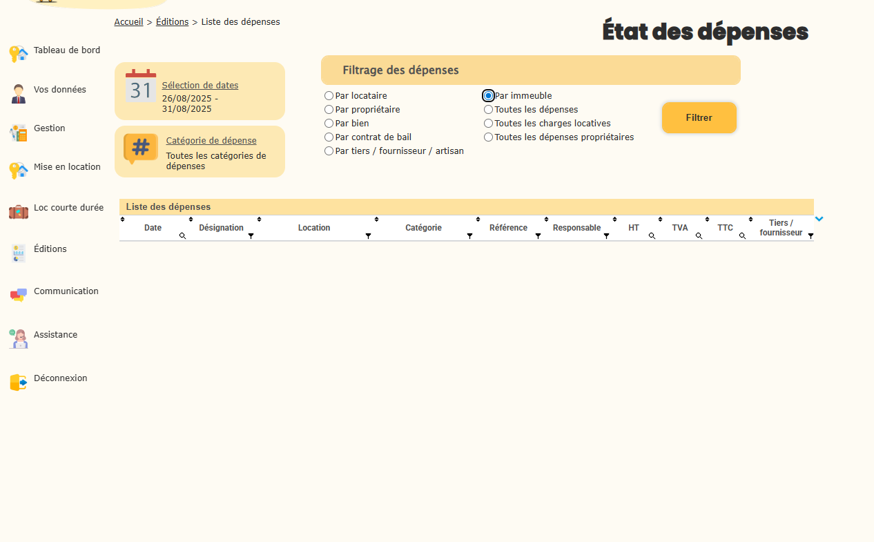 L’édition de la liste des dépenses est une fonctionnalité clé pour assurer une gestion locative transparente et efficace. Grâce aux filtres avancés, vous pouvez générer des états adaptés à chaque situation : par bien, par fournisseur, par locataire ou par propriétaire.