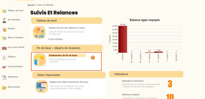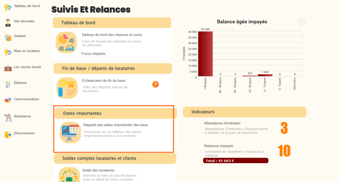Vous pouvez également vérifier les informations importantes concernant vos baux, en vous rendant dans la rubrique Rappels des dates importantes de baux, toujours dans le menu Suivis et relances.