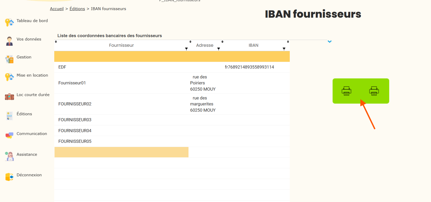 Pour éditer ou conserver un document regroupant les coordonnées bancaires, je vous invite à cliquer sur l'icône imprimante verte à droite de l'écran.