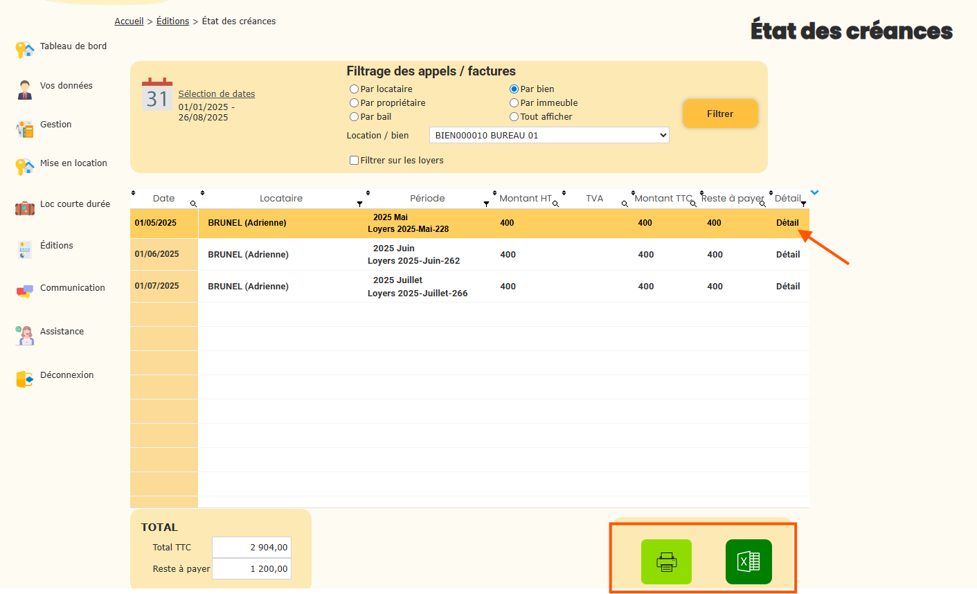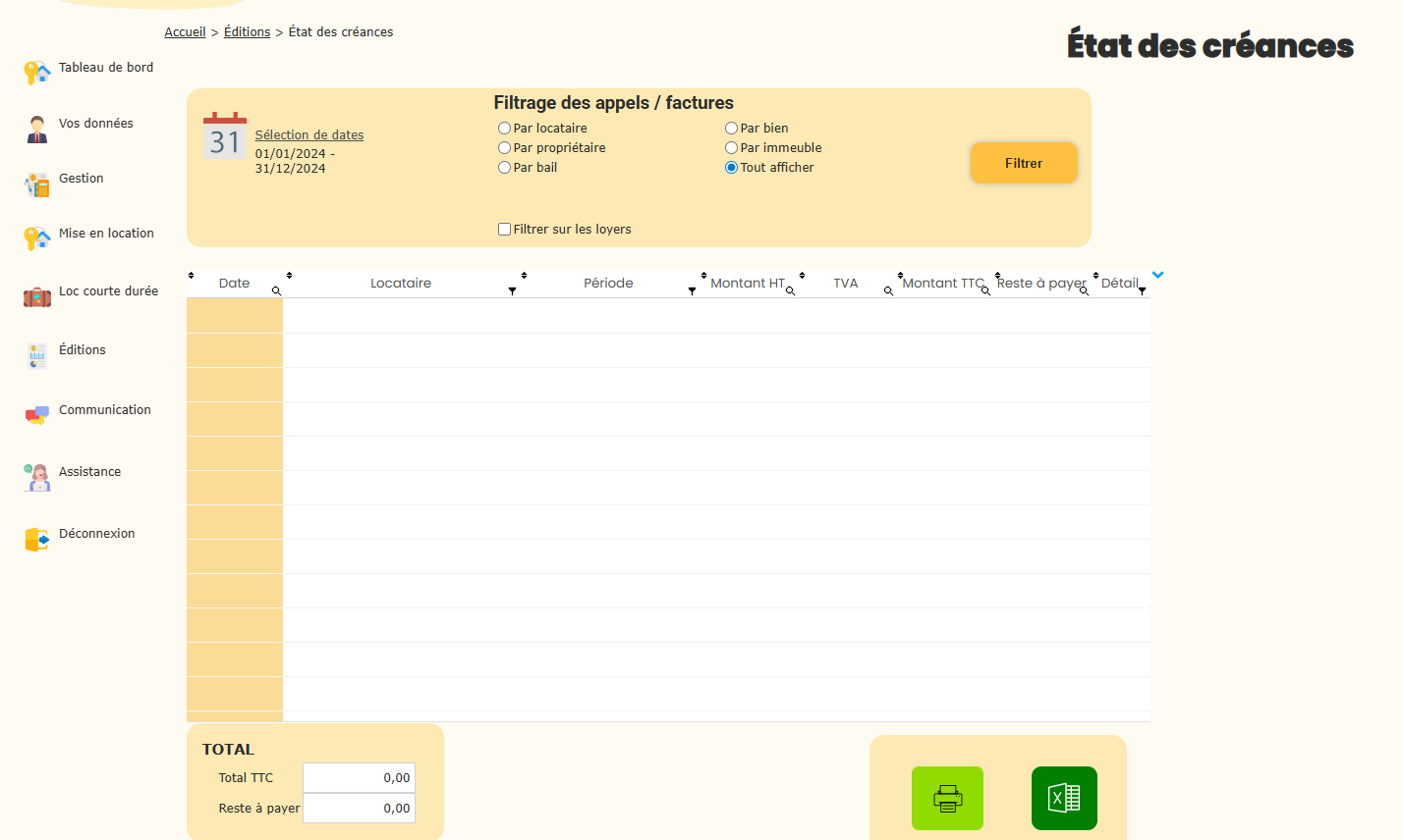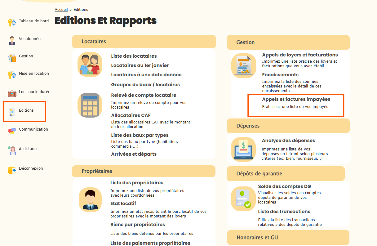 Enfin, choisissez Appels et factures impayés. Cette section permet de filtrer, consulter et éditer toutes les informations relatives aux loyers et factures en attente de paiement.