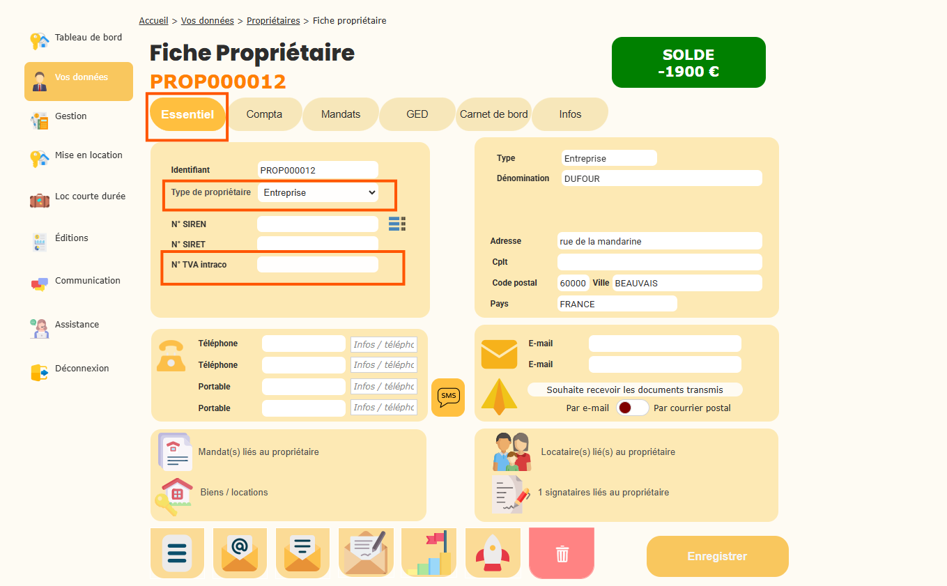 Cet onglet contient les informations contractuelles et administratives liées au propriétaire, dont l’emplacement dédié à la TVA intracommunautaire.