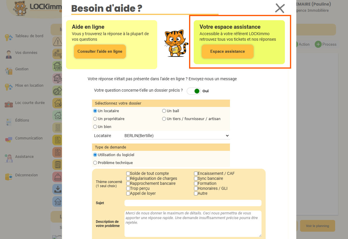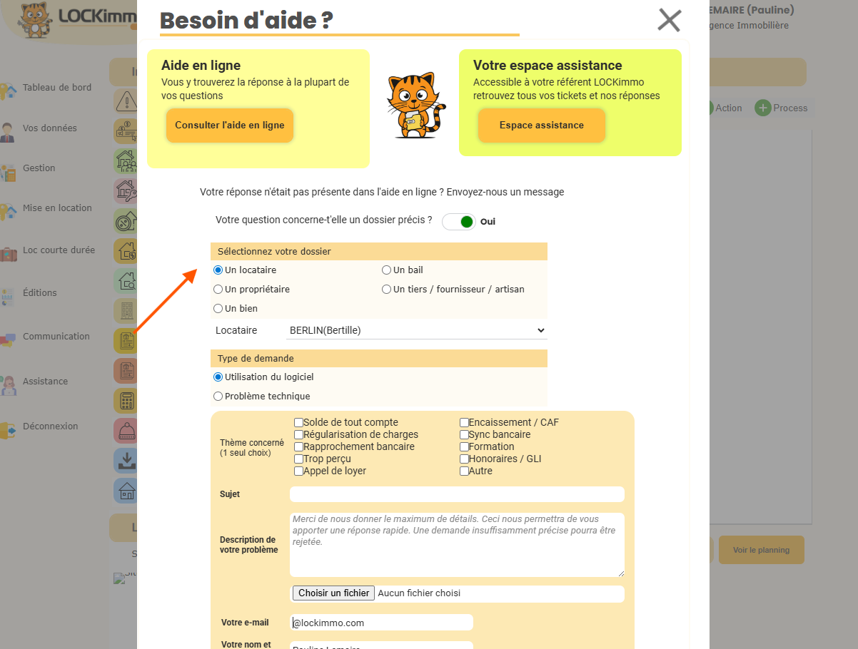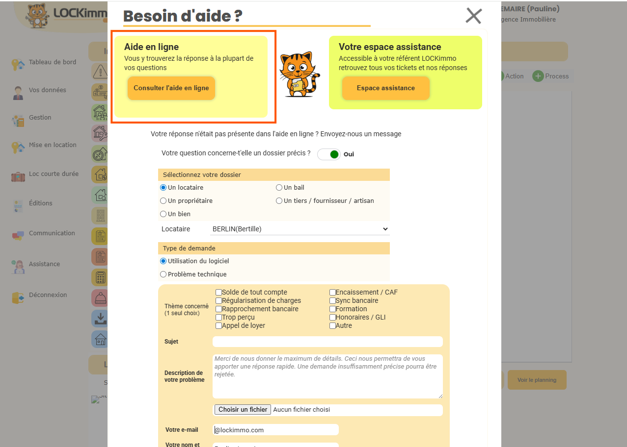 Si vous rencontrez un problème ou avez besoin d’assistance technique avec votre logiciel LOCKimmo, il est facile de contacter l’équipe Support directement depuis le module Assistance.