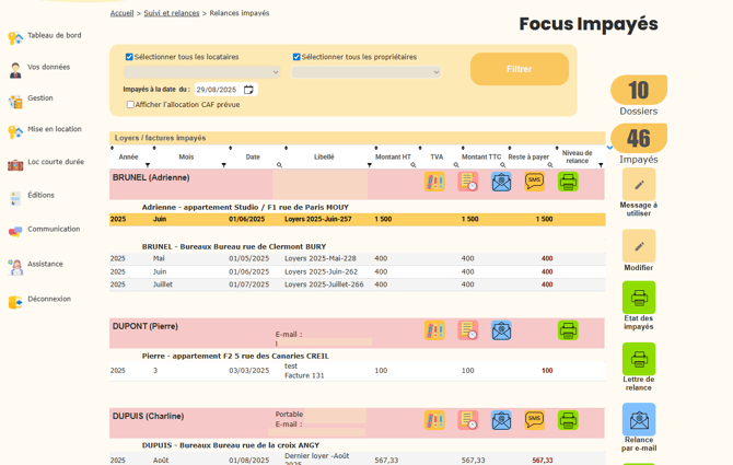 ✅ En résumé : l’écran Focus Impayés centralise les loyers et factures en retard de paiement et offre des outils simples et rapides pour lancer des relances adaptées par mail, SMS ou courrier.