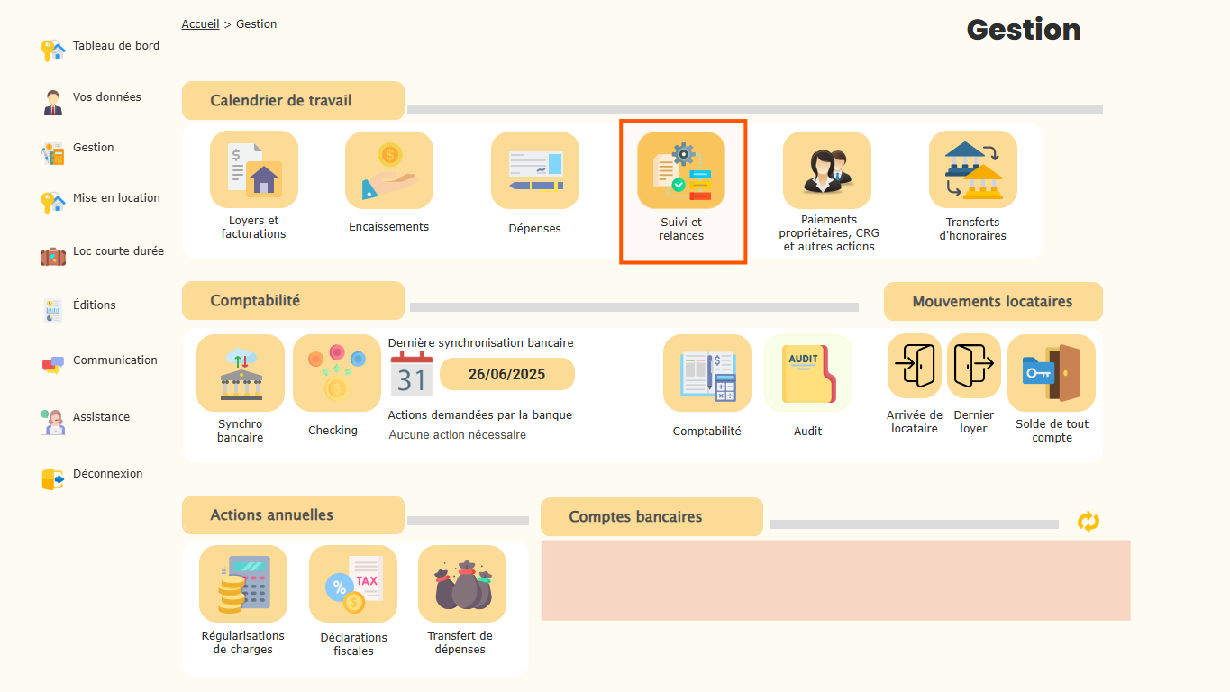 Pour accéder à la fonction de relance des impayés, commencez par ouvrir le menu "Gestion". Dans ce menu, sélectionnez l’onglet "Suivi et relances".