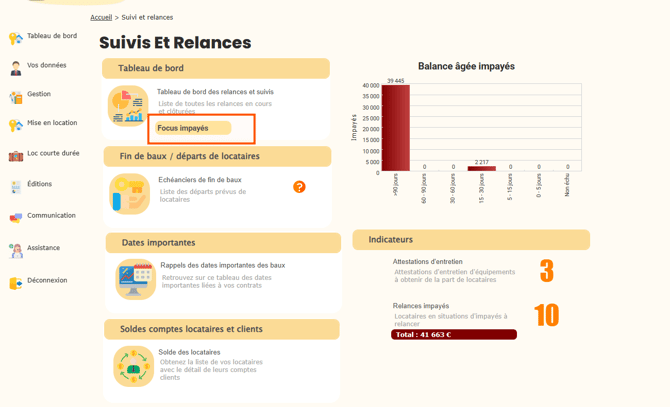 Vous y trouverez ensuite la rubrique "Focus impayés", qui vous permet de visualiser et de traiter les loyers non réglés.
