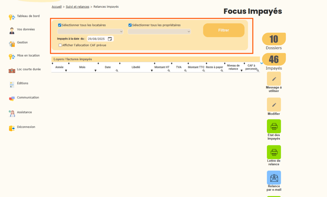 L’écran Focus Impayés permet de visualiser rapidement la liste des loyers et factures impayés par locataire et par période. Il centralise les informations essentielles et propose différents outils pour lancer des relances.