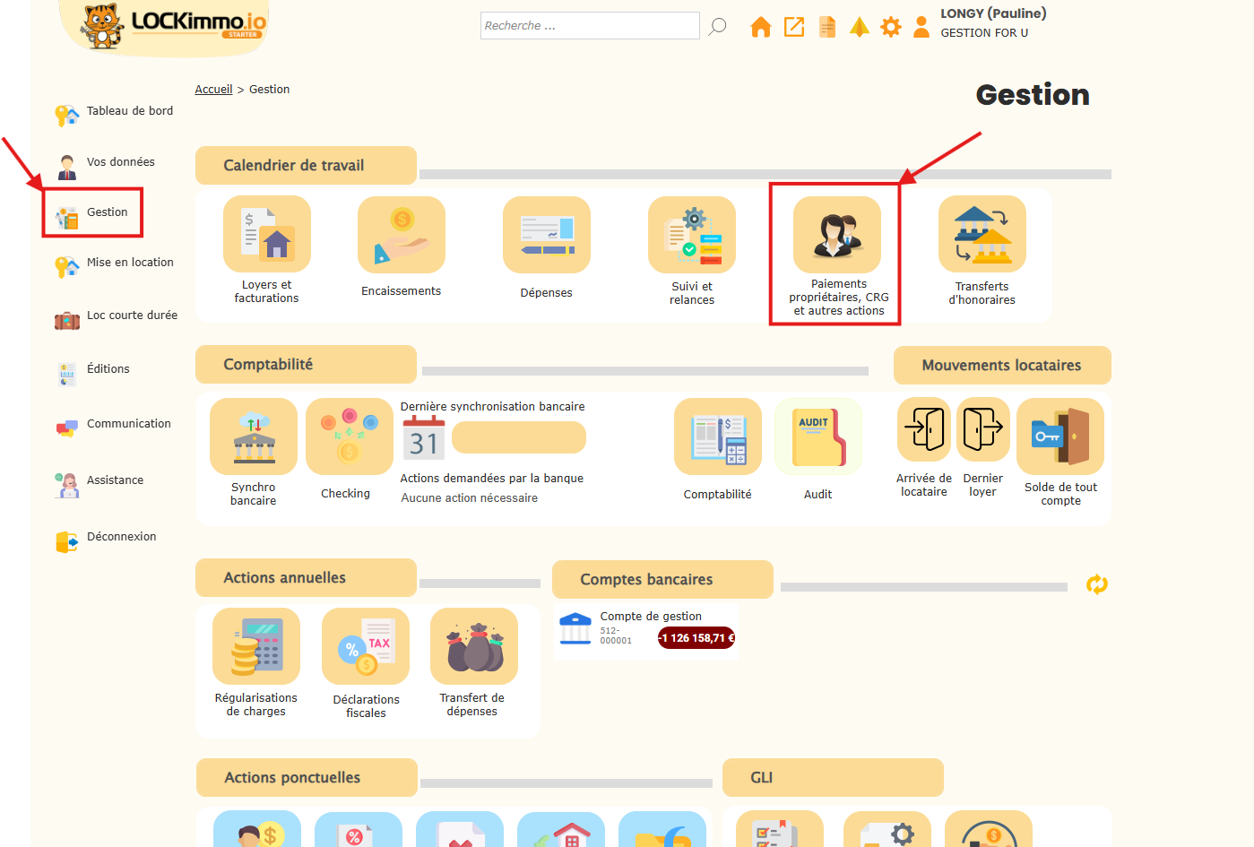 Rendez-vous dans le menu Gestion, puis sélectionnez Paiements propriétaires, CRG et autres actions.