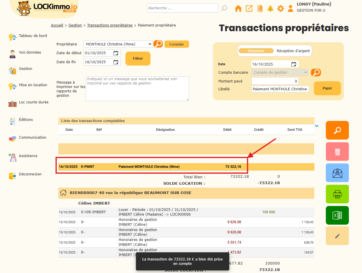 Après validation, une ligne de paiement est ajoutée automatiquement dans la liste des transactions comptables. Le solde du propriétaire est immédiatement mis à jour, ce qui permet de suivre en temps réel les paiements effectués et d’assurer la cohérence de la comptabilité.