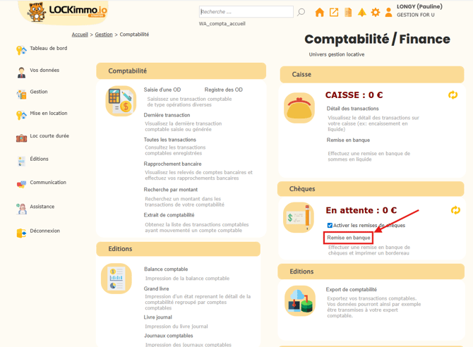 Dans l'encadré "Chèques", cliquez sur Remise en banque.