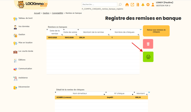 Bon à savoir : Dès la validation, LOCKimmo génère un bordereau de remise de chèques prêt à être déposé en banque. Vous pouvez également retrouver et télécharger ce bordereau ultérieurement depuis votre Registre des remises, qui centralise l'ensemble de vos historiques.