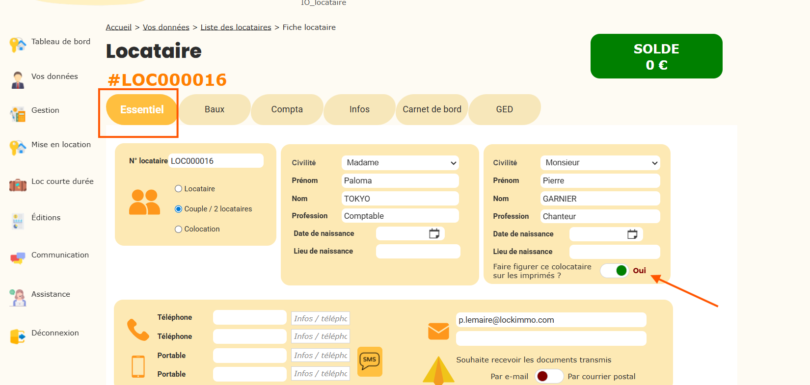 - Positionnez ensuite le bouton Faire figurer ce colocataire sur les imprimés? sur Oui.
