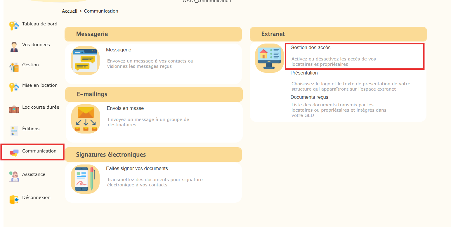 Accédez au menu Communication → Gestion des accès.
