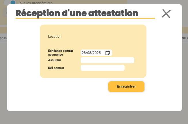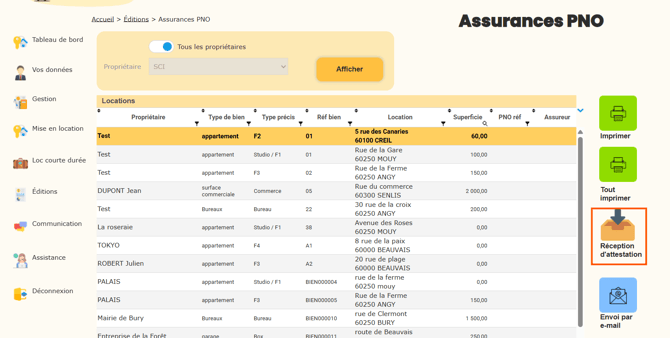 Pour chaque bien, vous avez la possibilité de réceptionner et enregistrer une nouvelle attestation.