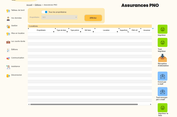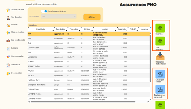 Dans cette rubrique, vous pouvez éditer la liste des biens ainsi que l’ensemble des informations relatives aux assurances Propriétaires Non Occupants (PNO).