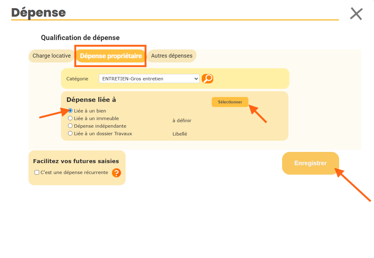 Dans l’onglet Dépenses propriétaires, sélectionnez la catégorie de dépense correspondante.