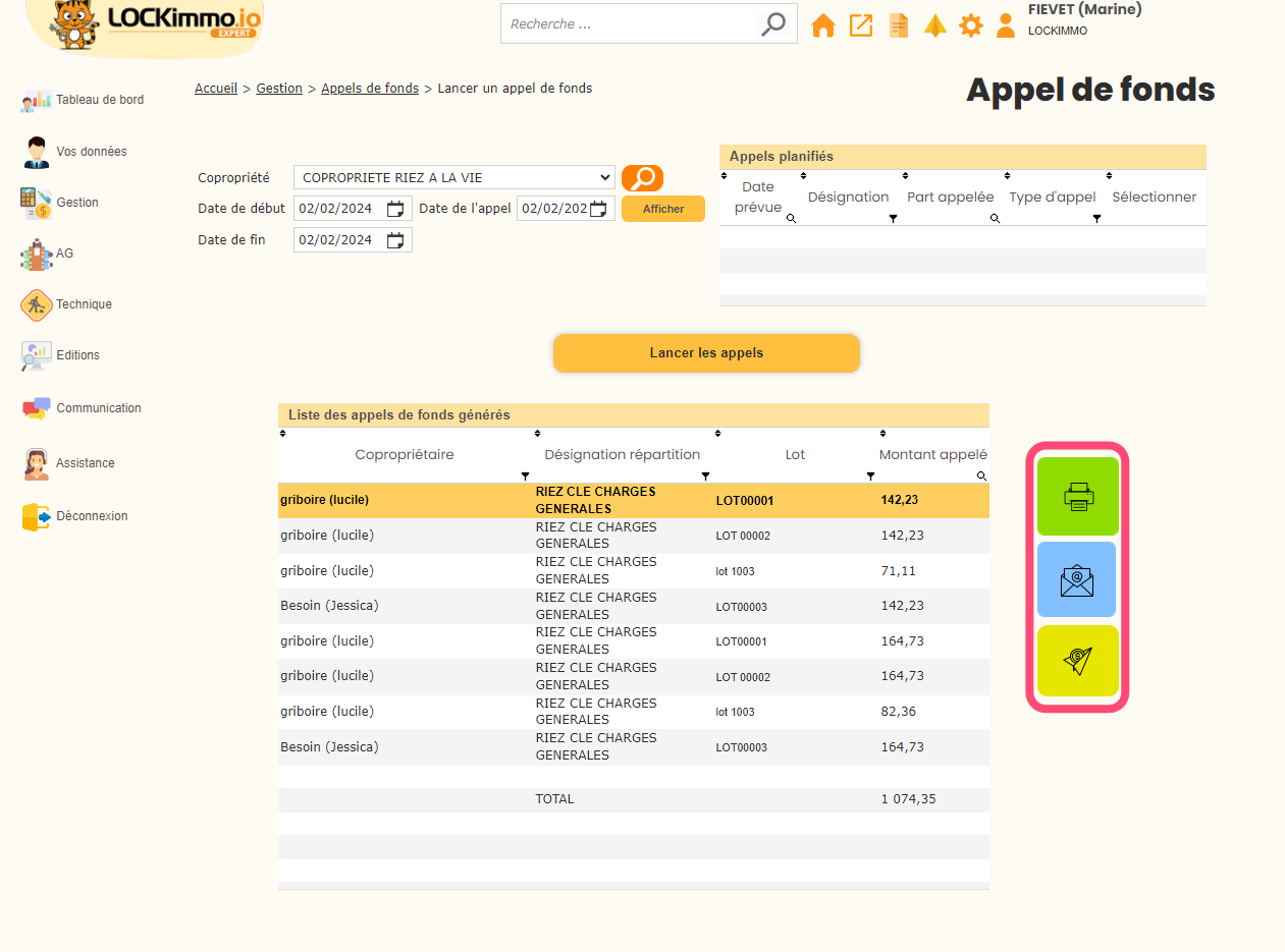 Sélectionnez la copropriété, la période, décochez les appels non souhaités.