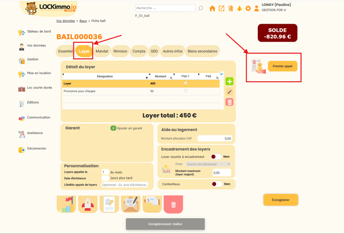 Dans la fiche du bail, cliquez sur l'onglet Loyer, puis sélectionnez le bouton Premier appel.