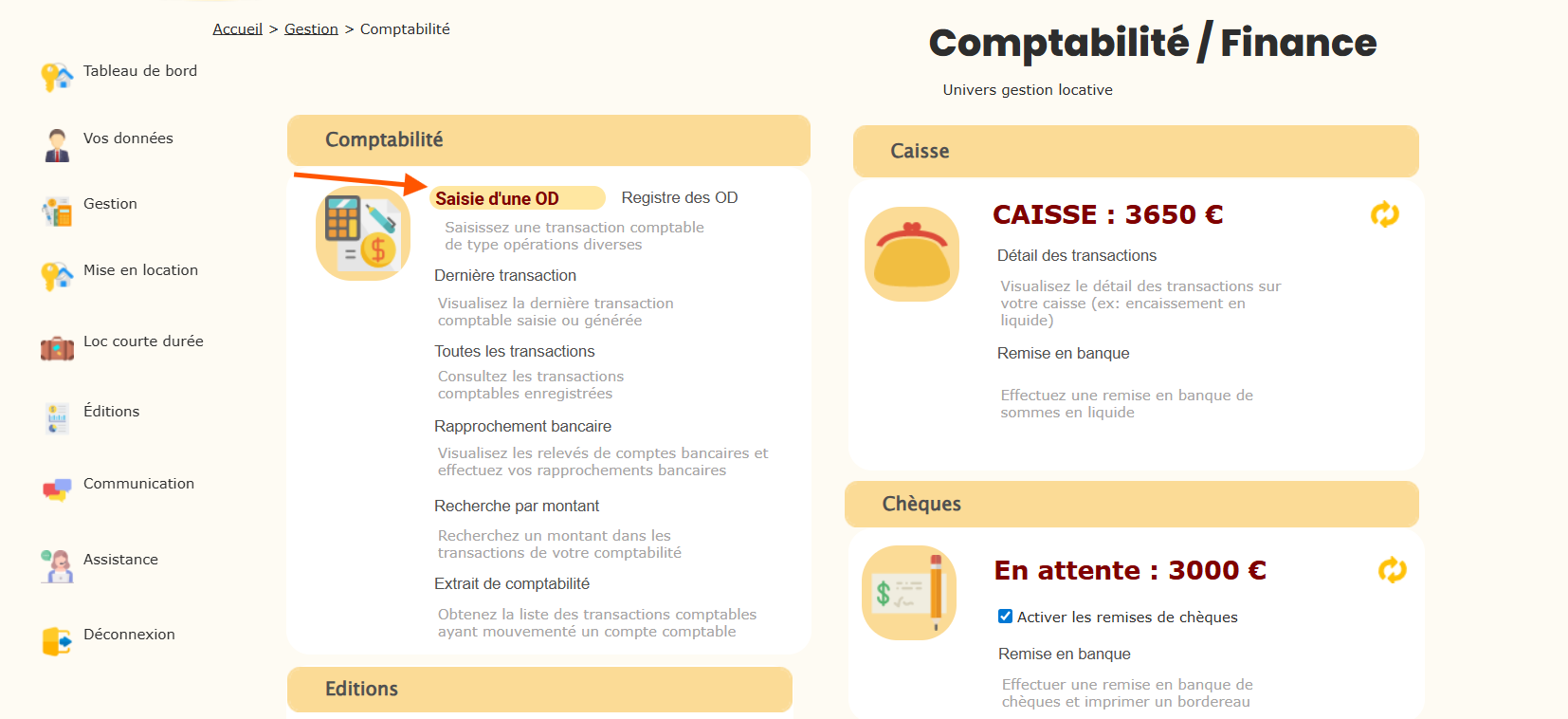 L’OD est un outil comptable qui permet d’enregistrer des écritures particulières ne relevant pas des opérations classiques (encaissements, décaissements, loyers, etc.).