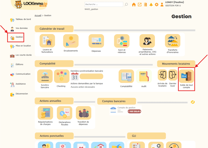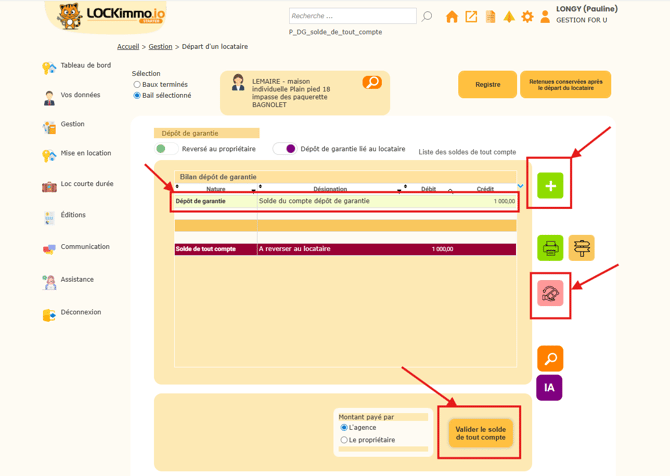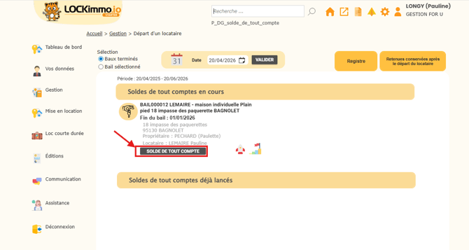 Cliquez sur le Solde de tout compte du locataire concerné pour accéder à la page de détail.