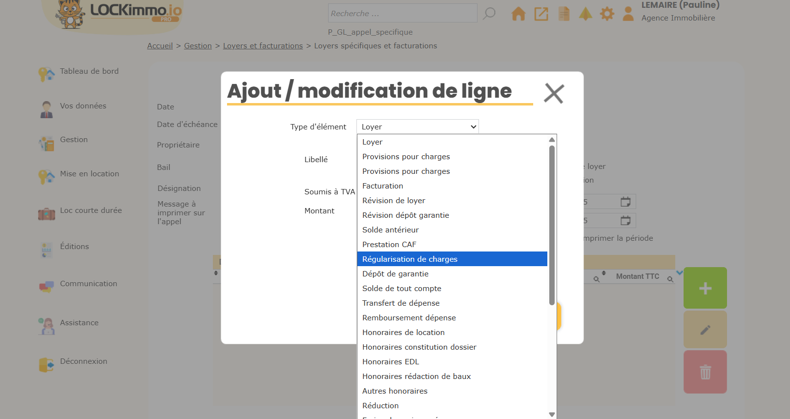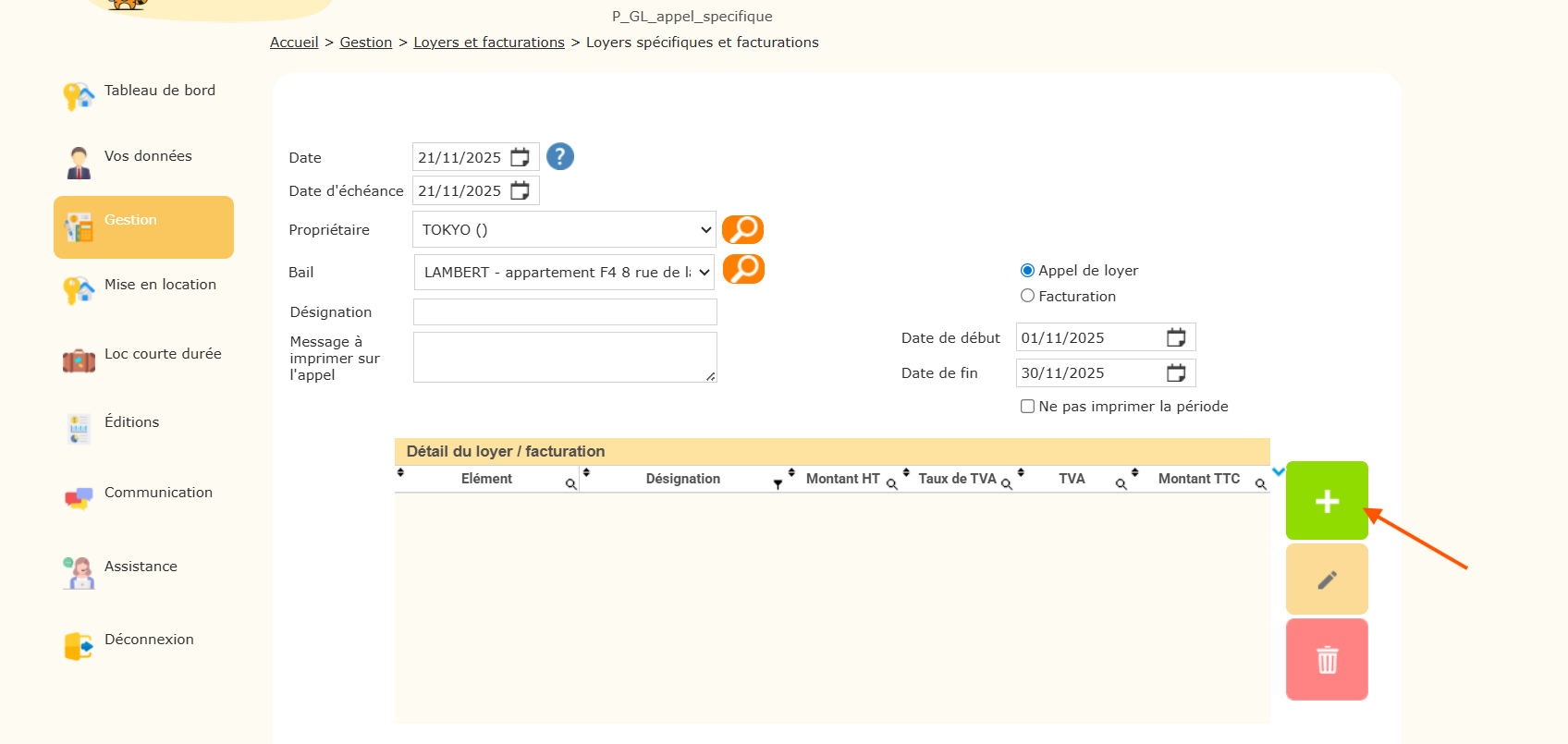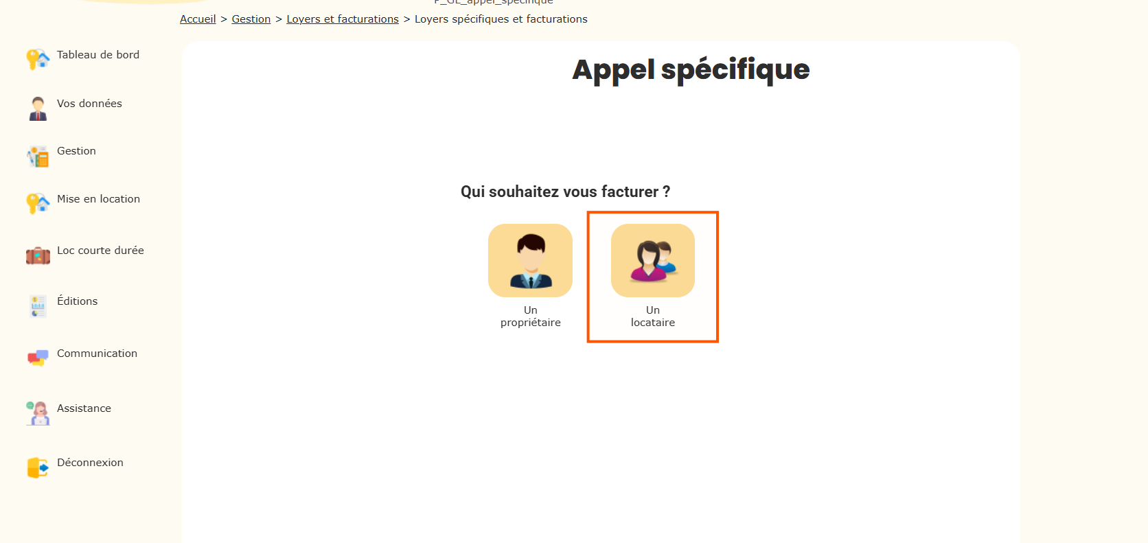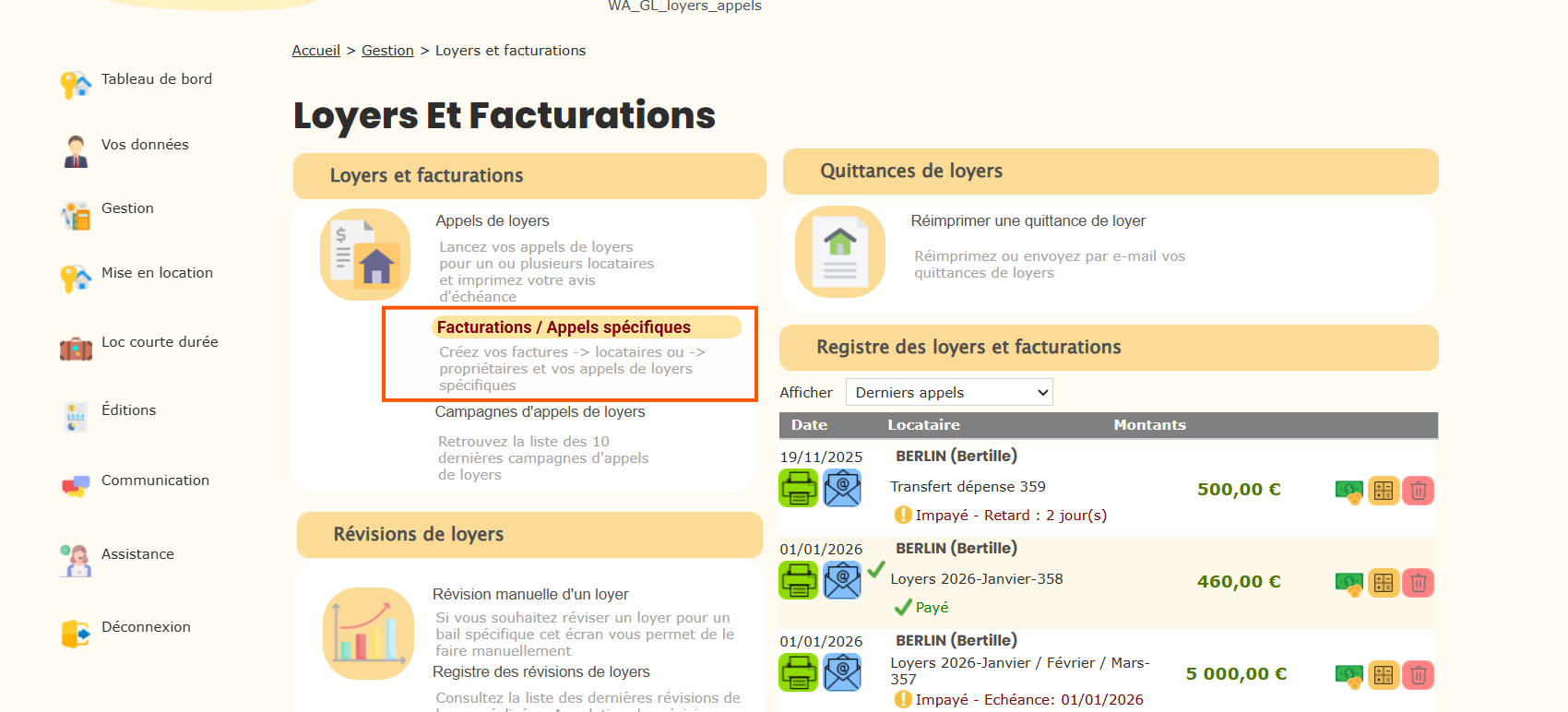 Gestion > Loyers/Facturations > Facturations / Appels spécifiques
