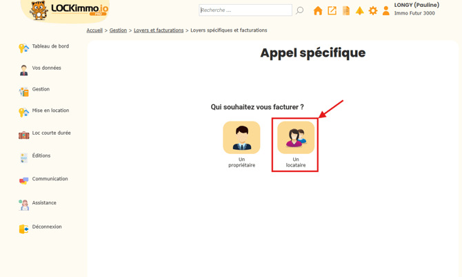 Choisissez le propriétaire concerné, puis sélectionnez le locataire. Le bail associé s’affichera automatiquement.