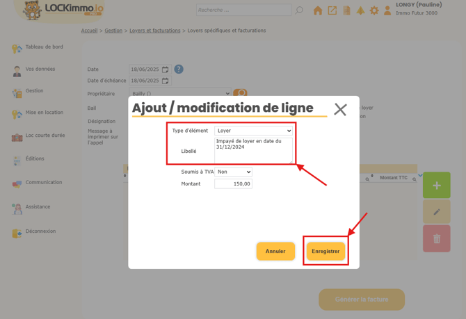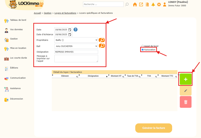 Cliquez sur le plus vert à droite de l’écran pour ajouter une ligne de loyer. Vous pouvez modifier le libellé (ex. : impayé de loyer en date du...).