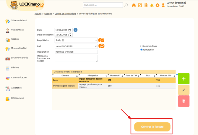 Lorsque vous effectuez une reprise de solde d’impayés, le logiciel crée automatiquement une facture que vous pourrez retrouver dans le registre des loyers et facturations.