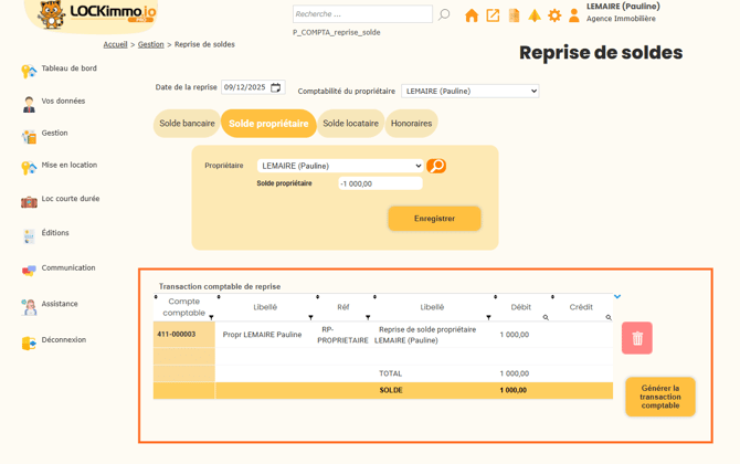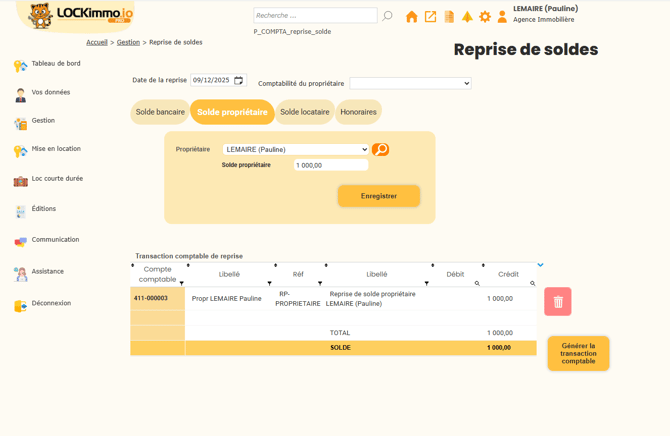 Cliquez sur Générer la transaction comptable pour finaliser la reprise de solde et l’intégrer définitivement dans la comptabilité.