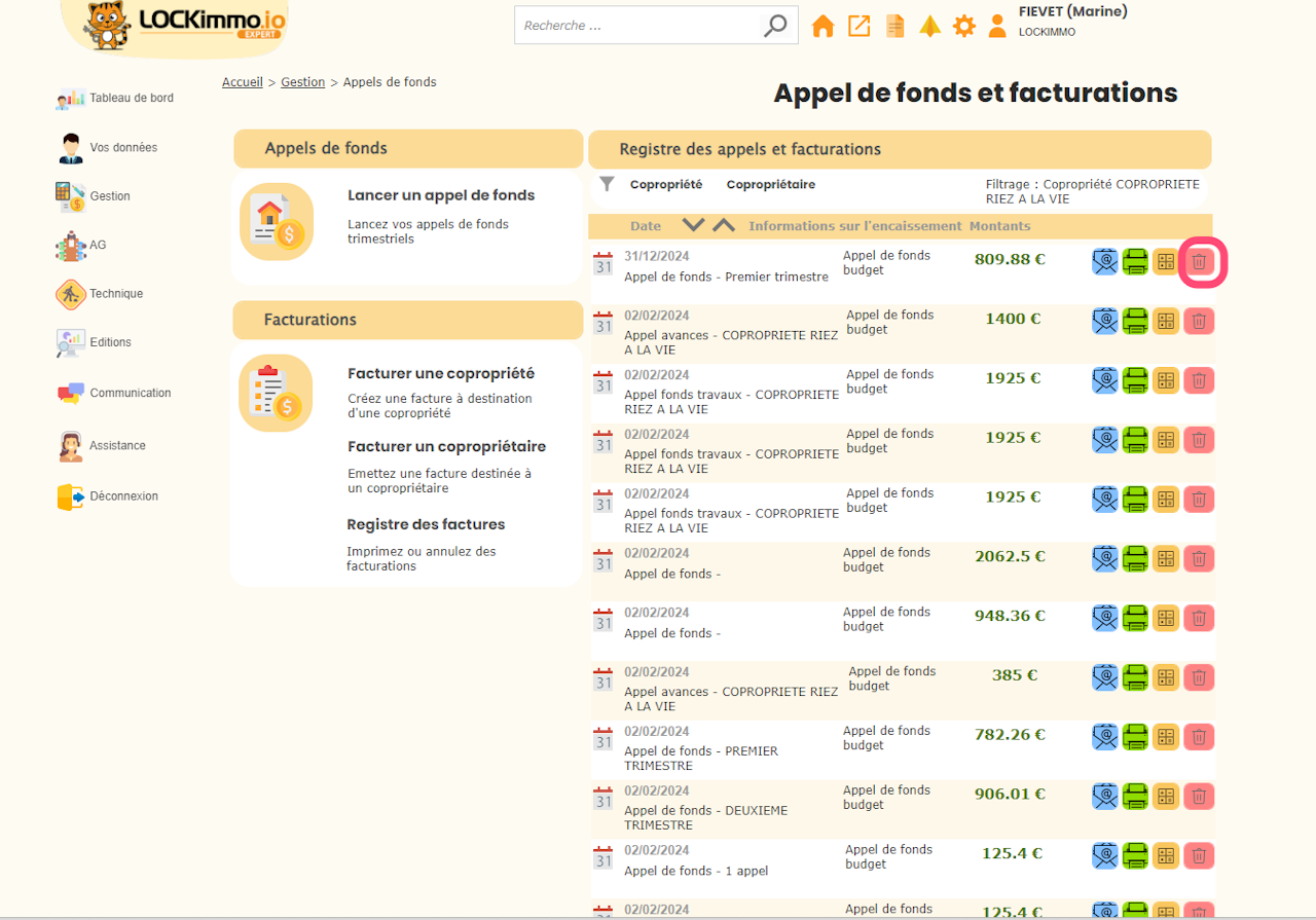 Sélectionnez la copropriété dont il est question, puis cliquez sur la poubelle rouge de l'appel de fond à supprimer.