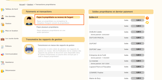 Cliquez sur le menu Gestion > Paiements propriétaires > Payer un propriétaire.