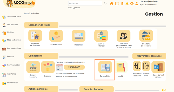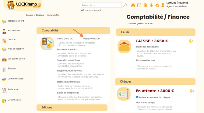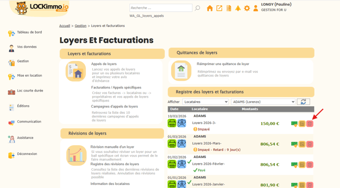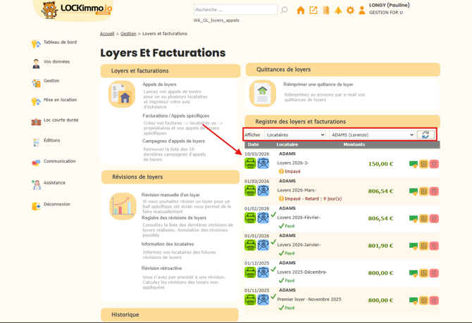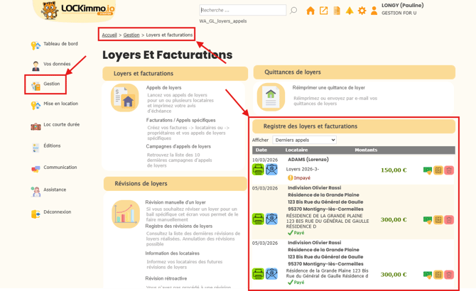 Rendez-vous dans le menu Gestion, puis Loyer et facturation. Vous trouverez sur la droite de la page l'accès au Registre des loyers et facturations.