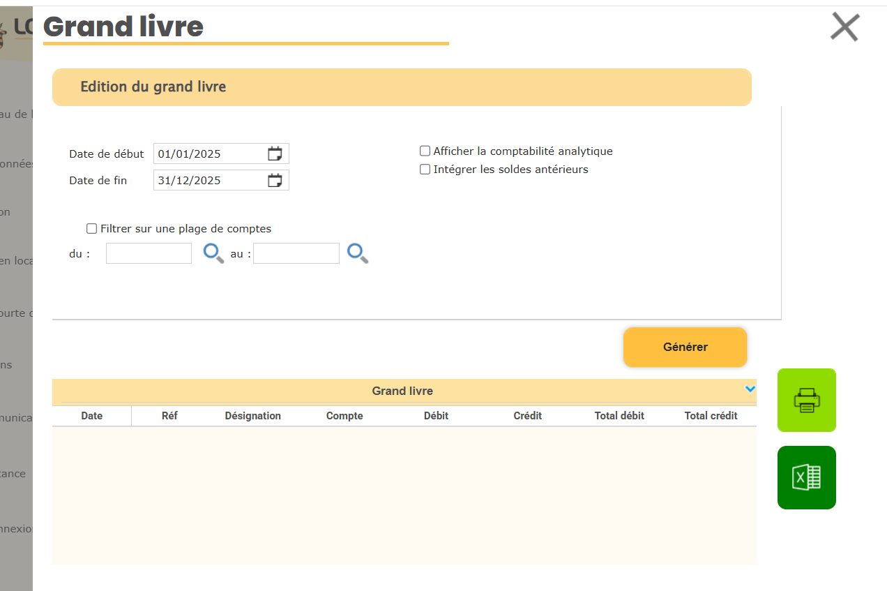 Vous accédez alors à la page où toutes les options pour générer le Grand Livre sont disponibles.