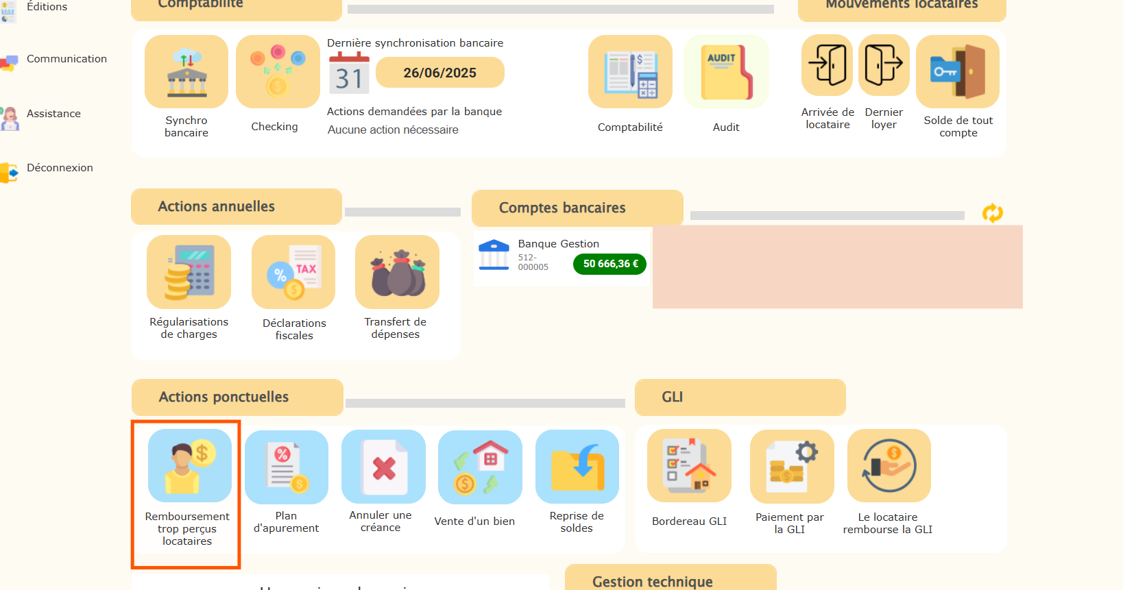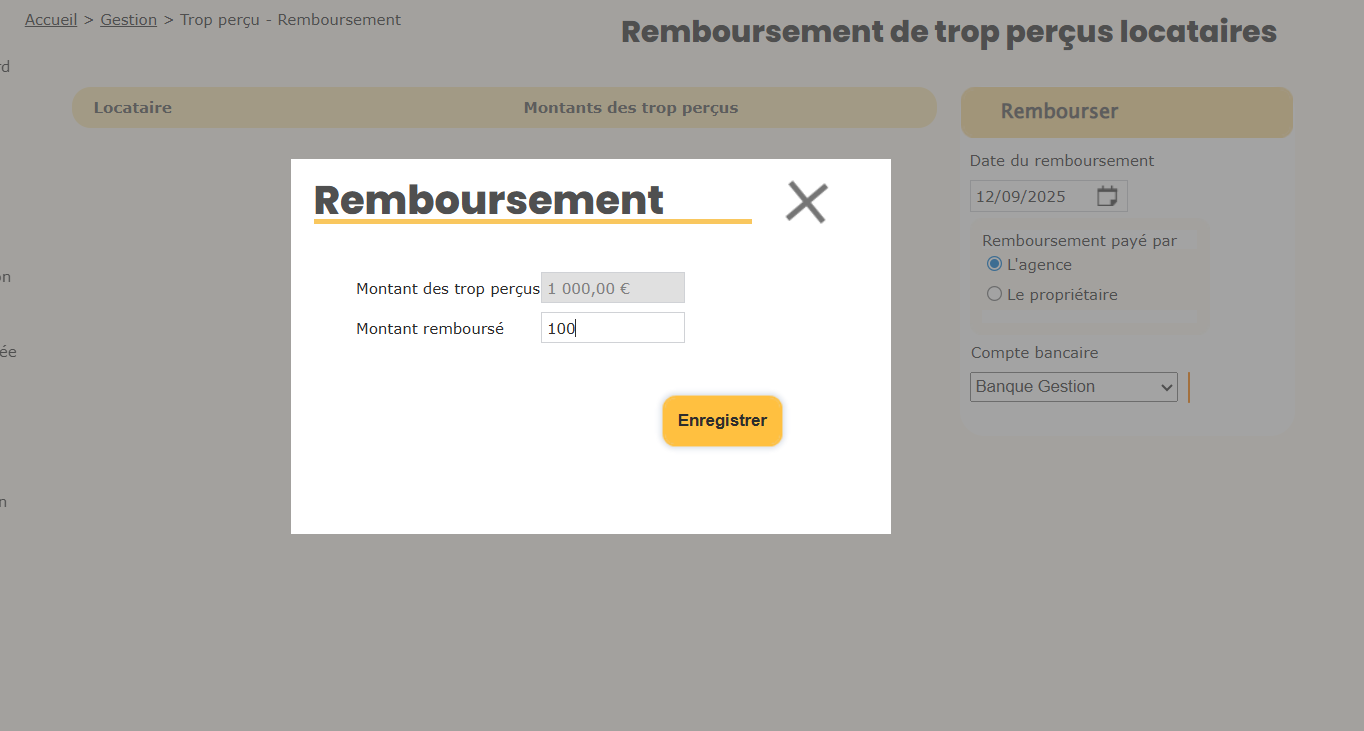 Rendez-vous dans le menu Gestion > Remboursement trop-perçus locataires.