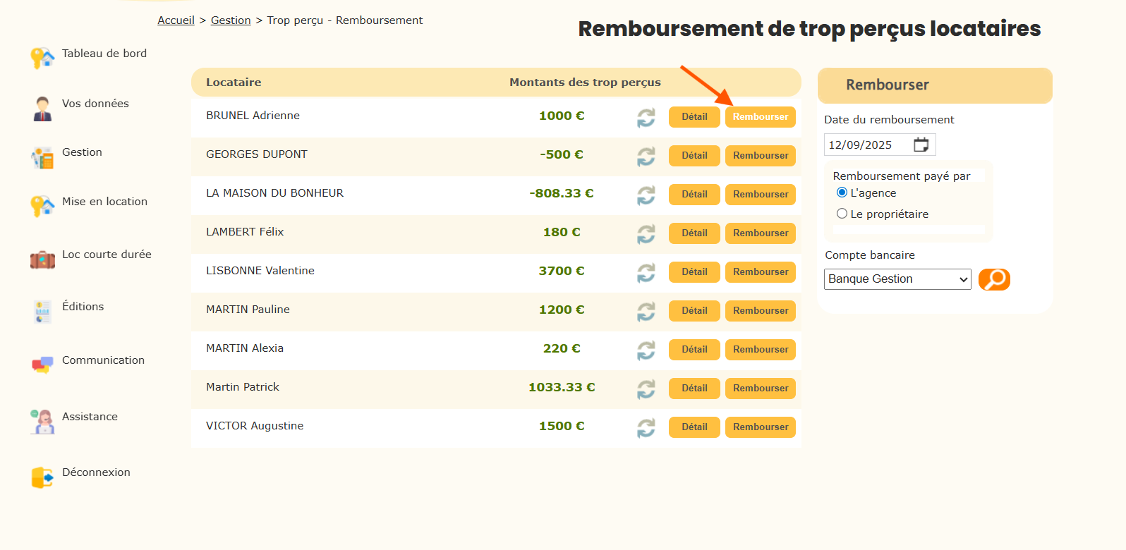 Cliquez sur le bouton Remboursement à droite du locataire concerné.
