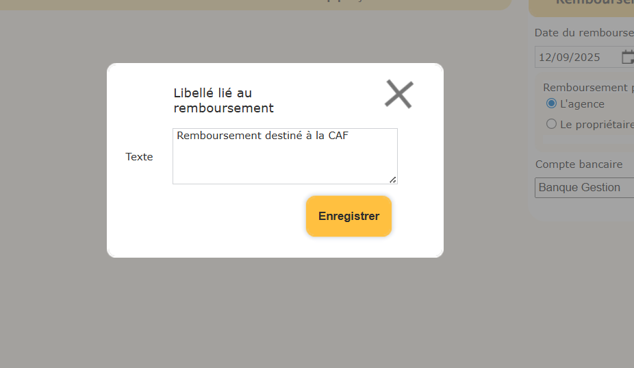 Dans le champ libellé lié au remboursement, dans le champs Texte, vous pouvez préciser qu’il s’agit d’un remboursement destiné à la CAF. Il faut cliquer sur le bouton Enregistrer pour finaliser la saisie.