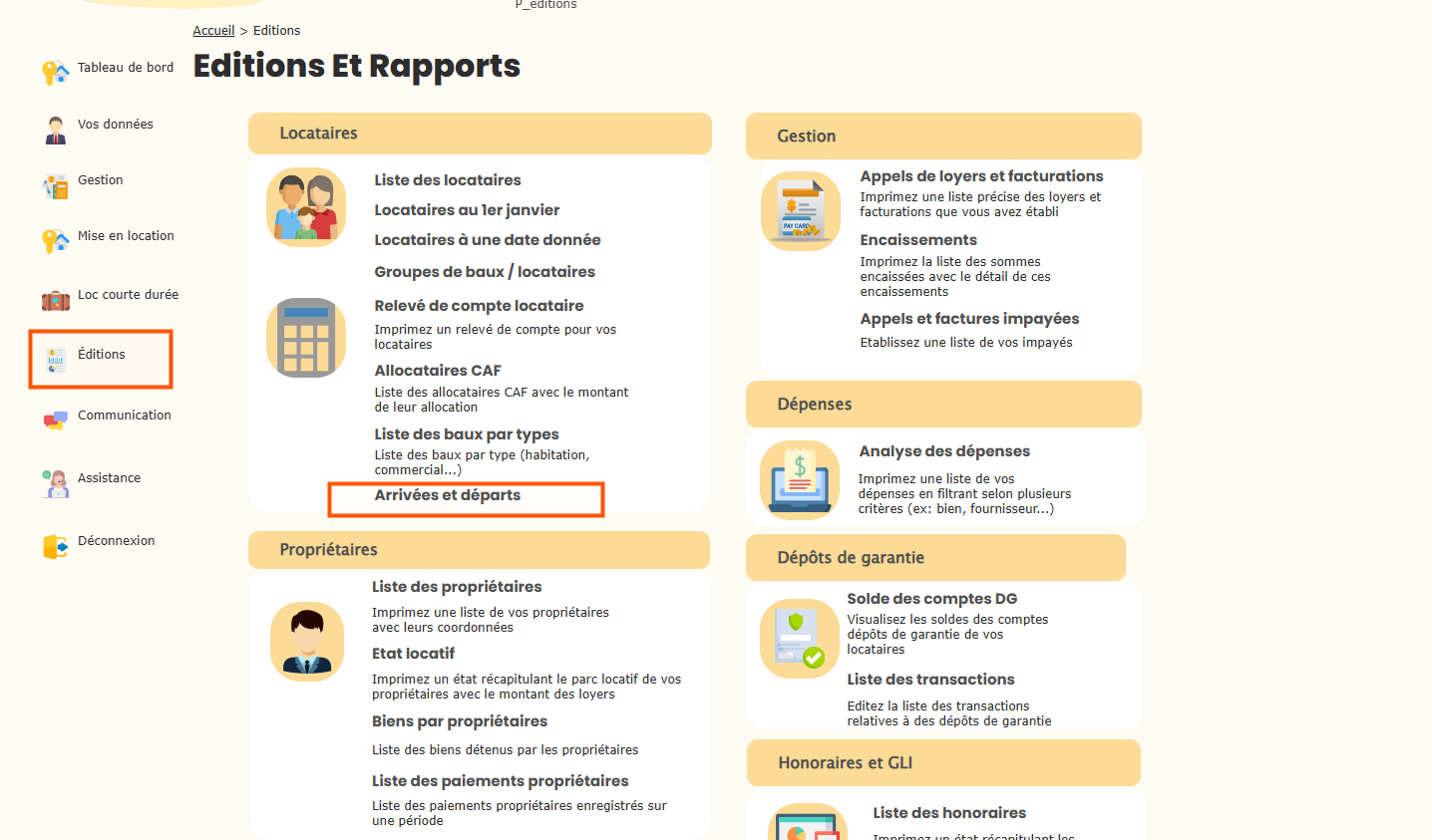 Il faut aller dans le menu Editions > Locataires > Arrivées et Départs