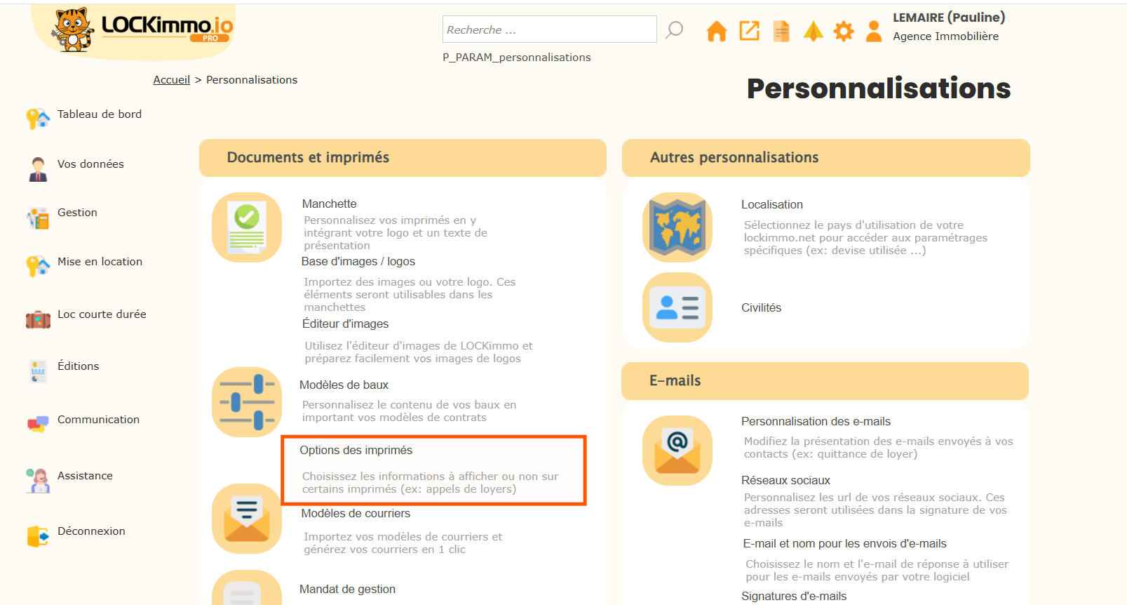 Accédez au menu Personnalisations → Options des imprimés dans votre interface.