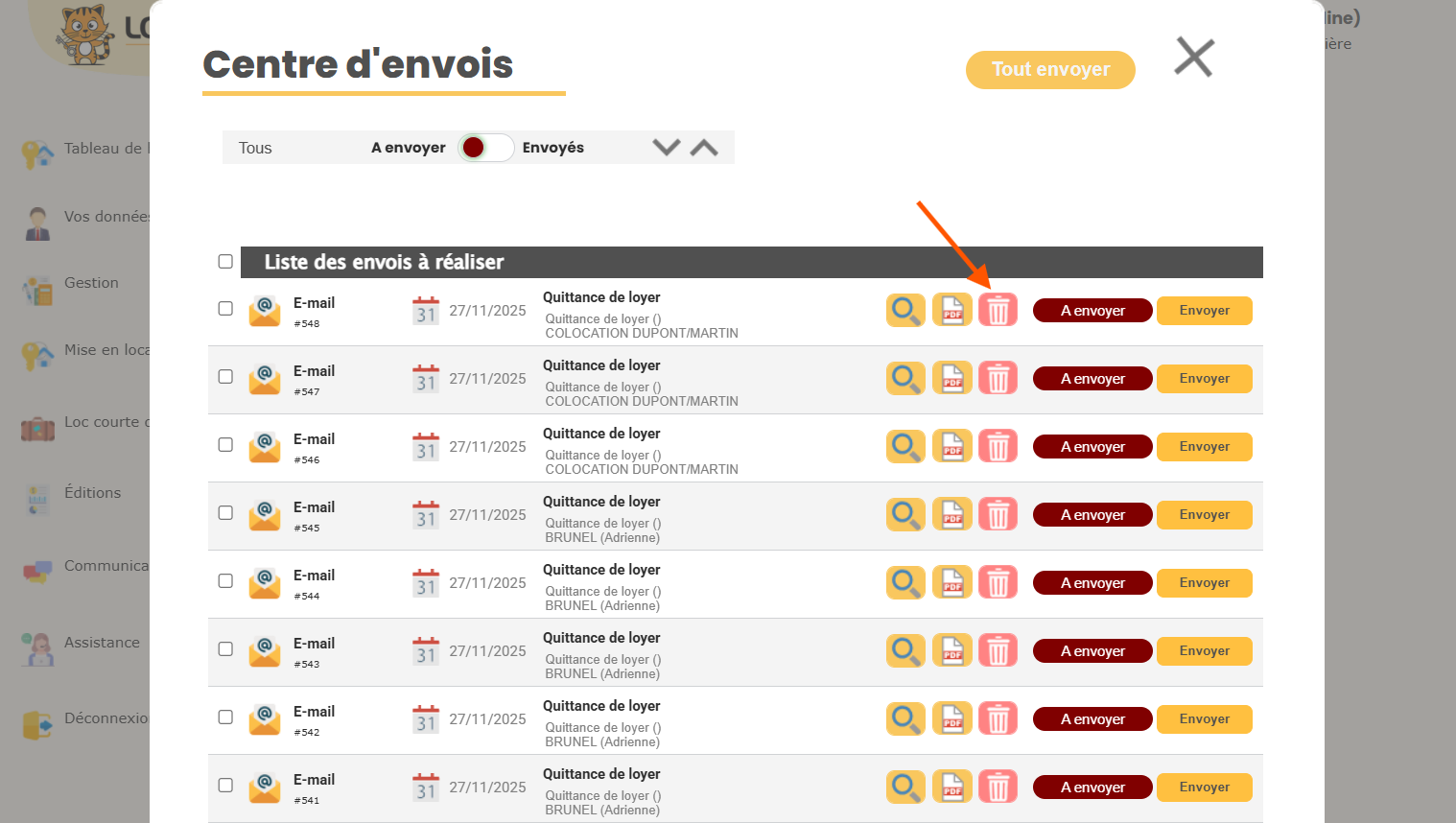 La deuxième option consiste à laisser la génération automatique activée, mais à intervenir manuellement pour supprimer certains envois avant qu’ils ne soient transmis aux locataires.
