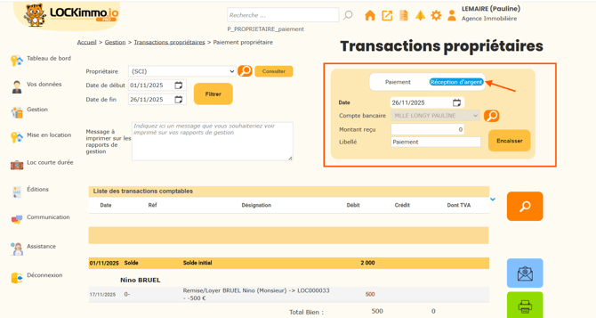 Vous pouvez saisir le montant reversé par le propriétaire, la date de réception, le compte bancaire et le libellé de votre choix.