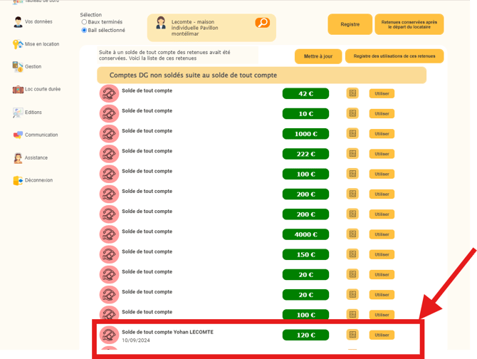 Vous pourrez consulter l’ensemble des retenues conservées. Il vous suffira de cliquer sur « Utiliser » : la somme sera alors transférée dans le trop-perçu du locataire et pourra être appliquée, par exemple, sur une facture de régularisation de charges.