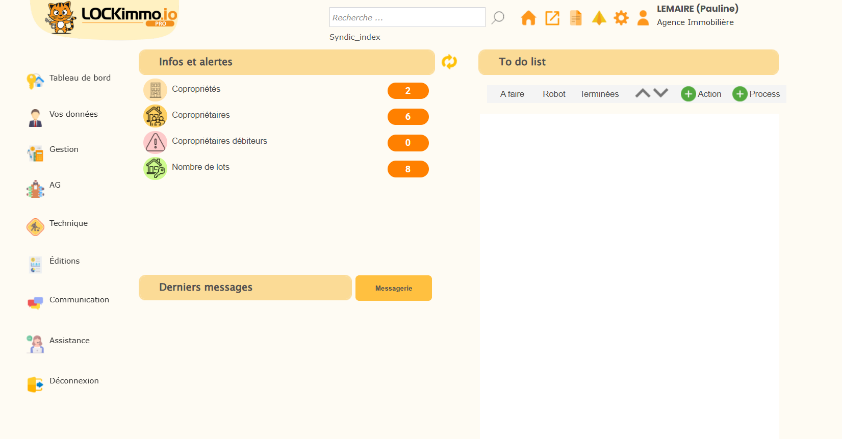 Cette page d’accueil offre une vue d’ensemble complète permettant d’accéder rapidement aux informations essentielles liées à la gestion immobilière. Qu’il s’agisse de suivre les copropriétés, consulter les derniers messages, créer des actions, surveiller les tâches automatisées ou naviguer dans les différents modules, l’interface est conçue pour fournir une expérience simple et efficace.
