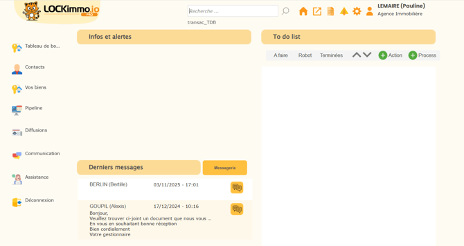 Chez LOCKimmo, vous bénéficiez d’un tableau de bord central qui vous offre une vue d’ensemble claire, avec des rappels et des informations utiles issues des données enregistrées dans votre base.