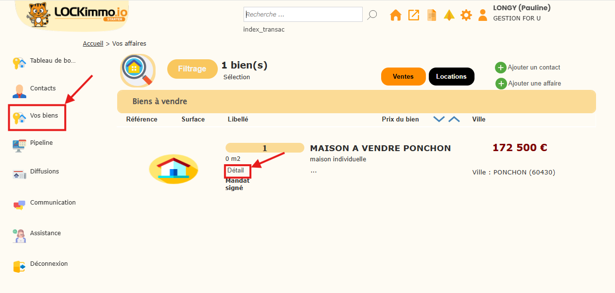 Dans le menu Vos biens, ouvrez la fiche du bien pour lequel vous souhaitez générer une affichette en cliquant sur Détails.