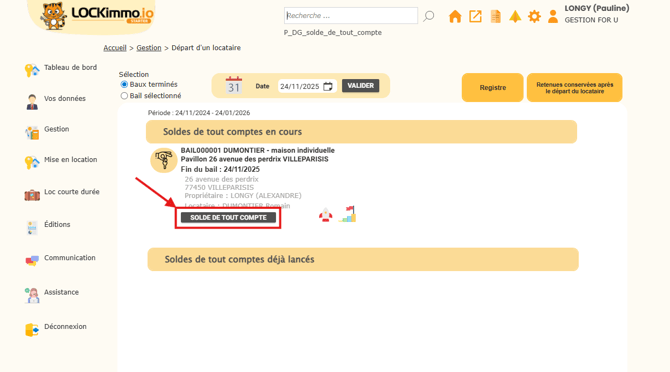 Accédez au menu Gestion puis sélectionnez Soldes de tout compte. Choisissez le locataire concerné et lancez la génération du solde de tout compte. À cette étape, il est essentiel de ne saisir aucune retenue. Le dépôt de garantie doit apparaître dans son intégralité, sans réduction ni mouvement, afin de pouvoir être transféré correctement vers le nouveau bail. Si une retenue est enregistrée, même par erreur, le montant du dépôt de garantie ne pourra pas être repris convenablement dans la suite du processus.
