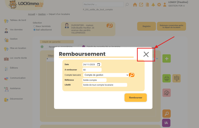 Une fois le solde de tout compte généré, le logiciel vous proposera automatiquement d’enregistrer un remboursement au locataire correspondant au dépôt de garantie. Il est très important de ne pas valider cette opération. Il faut simplement fermer la fenêtre ou refuser la saisie du remboursement. En procédant ainsi, aucun paiement n’est créé et le montant correspondant au dépôt de garantie est alors placé automatiquement dans le compte de trop-perçu du locataire. Cette étape est indispensable : elle permet de conserver la somme disponible pour la réutiliser dans le cadre du nouveau bail.