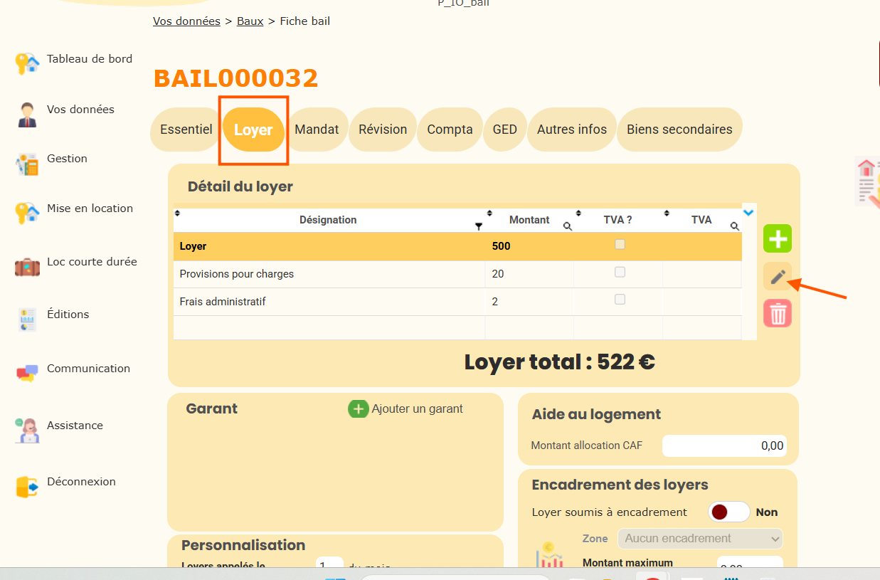 Dans l'onglet Loyer, sélectionnez la ligne de loyer etcliquez sur le crayon à droite.